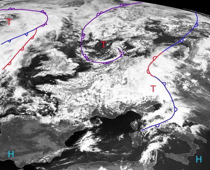Tief 'Viola' über der Nordsee, Tief 'Wolfhilde' über den Alpen und ein weiteres, noch namensloses Tief bei Irland bringen heute Mittag verbreitet viele Wolken über Europa. Insbesondere über Polen und Südostdeutschland sind die Wolken dicht und hier fällt auch teils kräftiger Regen bzw. kommt es zu Gewittern. Größere Wolkenlücken zeigen sich dagegen über der Mitte und dem Süden der Iberischen Halbinsel sowie vom südlichen Italien bis nach Kroatien. (Bildquelle: Copyrigt EUMETSAT, NERC Satellite Receiving Station, University of Dundee)