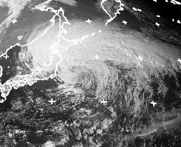Im Nordosten von Japan liegt ein ausgeprägtes Orkantief, dessen Wolkenschirm auf dem Bild gut zu erkennen ist. An der japanischen Küste sind Orkanböen möglich. Durch das Aufgleiten feuchtwarmer Luft aus den Tropen kommt es im Norden Japans zudem zu sehr ergiebigen Regenfällen.