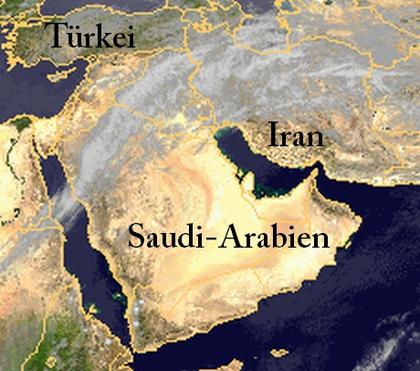 Eine Luftmassengrenze liegt heute mit ihren Wolken und Regen vom nördlichen Saudi-Arabien bis zum nördlichen Iran. Diese Grenze trennt warme Luft im Süden von kalter im Norden. Die Wolken kommen aber kaum noch nach Süden voran, sodass es hier weiter sonnig und trocken bleibt. Allmählich löst sich die Luftmassengrenze in den nächsten Tagen dann auf.