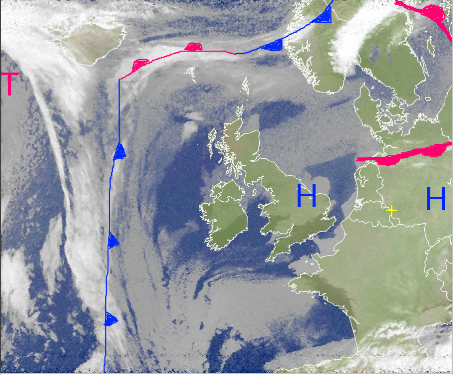Wolken über der Nordsee und Norddeutschland trennen unterschiedlichen Luftmassen.
