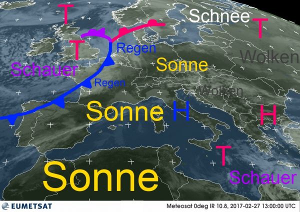 Das Satellitenfoto von heute Mittag zeigt uns die ungefähre Wetterverteilung in Europa. Die Sonne scheint über weiten Teilen Südeuropas, Nordafrikas, aber auch gebietsweise in Deutschland. Im östlichen Mittelmeerraum sorgt ein Tief weiterhin für Regen und Schauer. In Skandinavien und Russland fällt gebietsweise Schnee.
