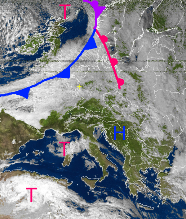 In der Nacht und Morgen überquert uns die Kaltfront des Tiefs über dem Nordmeer mit Regen und Wind. Hinter der Front gehen die Temperaturen wieder zurück und in den Alpen sinkt die Schneefallgrenze.