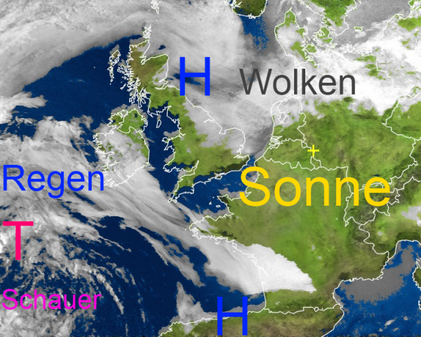 Auffällig ist das stark abgegrenzte Wolkenfeld über Südwestfrankreich. Hierbei handelt es sich um hochnebelartige Bewölkung und Küstennebel, der sich über dem noch vergleichsweise kühlen Wasser der Biskaya gebildet hat und mit dem Wind ins Landesinnere gedriftet ist. Ähnliches Phänomen wie auch über der Nordsee.