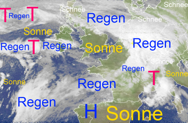 Die Luftmassengrenze, zu erkennen an dem langgestreckten Wolkenband vom Atlantik, über Schottland und die Nordsee hinweg bis nach Tschechien trennt kalte Polarluft von milder Subtropikluft. Dort wo milde und kalte Luft aufeinandertreffen drohen kräftige Niederschläge. Auf der kälteren Seite der Zone fällt Schnee oder Schneeregen bis in tiefere Lagen, auf der milderen Seite fällt Regen. In Verbindung mit der Schneeschmelze in den Bergen schwellen Bäche und Flüsse deutlich an.