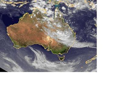 Auf dem Satellitenbild von Mittwoch früh sind vor allem im Norden und Osten von Australien Schauer- und Gewitterwolken gut zu erkennen. Sie sorgen heute für teils kräftige und ergiebige Niederschläge. Weiter im Süden und im Westen sorgt Hochdruckeinfluss für meist freundliches und trockenes Wetter.
