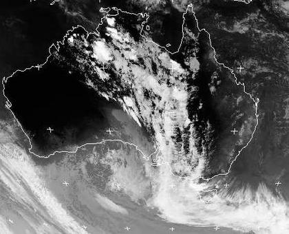Bei Tasmanien liegt ein Tief, dessen Ausläufer bis in den Norden des Kontinents reicht. Er bringt Regenfälle und Gewitter in das Zentrum und morgen auch in den Südosten Australiens. Sonst ist es über dem Kontinent wolkenarm.
