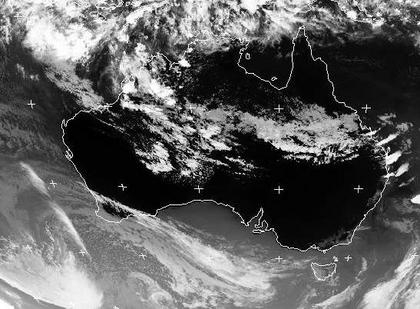 Auf dem Satellitenbild von Mittwoch früh sind Schauer- und Gewitterzellen im Norden und in der Mitte von Australien gut zu erkennen. Die Hochreichenden, und damit kalten Wolkenoberkanten (im Infrarotbild weiß dargestellt) heben sich stark vom warmen Erdboden ab (im Infrarotbild schwarz dargestellt).