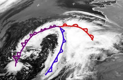Auf dem Satellitenbild von Sonntag früh ist ein Tief über den Azoren gut zu erkennen. Seine Fronten ziehen heute über die Iberische Halbinsel hinweg, und sorgen heute vor allem in Portugal für zum Teil kräftige Schauer und Gewitter.