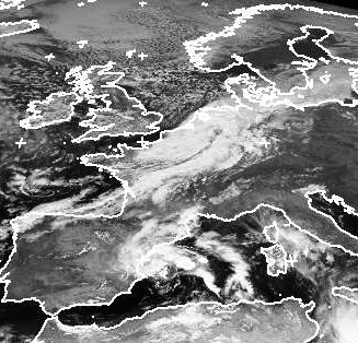 Auf dem Satellitenbild vom Mittwochmittag liegen von der Ostsee über Nordwestdeutschland bis nach Nordfrankreich dichte Wolken. Sie gehören zu einem Ausläufer von Skandinavientief 'Munir'. Weiter nach Süden und Osten werden die Wolken weniger. Der Tiefausläufer verlagert sich aber weiter in diese Regionen. Dahinter strömt von Norden polare Kaltluft nach Deutschland. Über der Nordsee erkennt man schon lockere Schauerbewölkung, die sich in der kalten Luftmasse gebildet hat. (Bildquelle: NERC Satellite Receiving Station, Dundee University, Scotland, http://www.sat.dundee.ac.uk/)