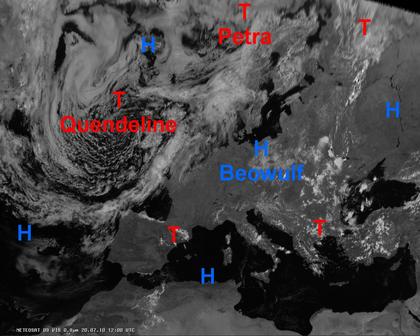 Auf dem heutigen Satellitenfoto sind 2 ausgeprägte Tiefdruckgebiete von den Britischen Inseln bis nach Skandinavien zu sehen. Diese Tiefdrucksysteme sorgen hier für weitgehend kühles und wechselhaftes Wetter mit häufigen Schauern, teils auch mit Gewittern. Ansonsten herrscht in Europa weiterhin sommerliches Hochdruckwetter mit zum Teil sehr heißen Temperaturen.
