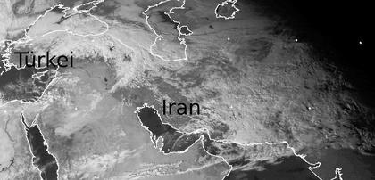 Über den Norden der Türkei liegt am Samstag Mittag starke Bewölkung. Sie bringt hier einigen Schnee, da die Temperaturen durch Zufuhr kontinentaler Kaltluft aus Nordosten vielfach unter 0°C liegen. Nur an den Küsten zum Schwarzen Meer fällt Regen. Auch im Osten des Irans sowie in Afghanistan und Pakistan bringen dichte Wolken häufig Schnee, nach Süden hin auch Regen. Wenige Wolken finden sich dagegen auf der nördlicher Arabischen Halbinsel. (Bildquelle: NERC Satellite Receiving Station, Dundee University, Scotland, http://www.sat.dundee.ac.uk/)