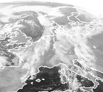 Über Deutschland erkennt man viele Wolken. Die Wolken im Osten gehören zur Kaltfront des Nordmeertiefs 'Hildburg', die sich allmählich auflöst. Besser zu erkennen ist noch Tief 'Isolde' nördlich von SChottland, dessen Kaltfront in den Westen Deutschlands zieht. Aber auch hier fällt nicht viel Regen. Die Luft wird von Westen her auch nur leicht kühler. Zwischen den Wolken gebieten ist zudem noch ein schmaler Streifen mit weniger Wolken zu finden. (Bildquelle: NERC Satellite Receiving Station, Dundee University, Scotland, http://www.sat.dundee.ac.uk/)