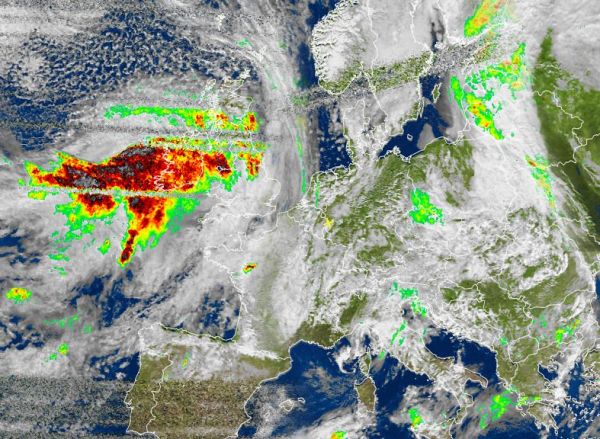 Auf dem Satellitenbild von heute Nachmittag ist ein ausgeprägter Ausläufer des Islandtiefs "Cordula" über dem Atlantik zu sehen. Hier peischt der Regen mit Sturmböen über das Meer, vor allem über Irland sind die Ausläufer mit viel Regen und Wind jedoch ebenfalls deutlich zu spüren. Im weiteren Verlauf verlagert sich das intensive Regen- und Sturmgebiet weiter nach Südosten und überzieht in der Nacht Wales und das südliche England. Ab dem Morgen werden dann auch an der französischen Atlantikküste und auch weiter im Landesinnern dicker Regen und Sturmböen erwartet.