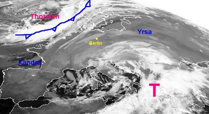Eine Hochdruckbrücke erstreckt sich von Frankreich über Mitteleuropa bis nach Westrussland und sorgt heute noch für ruhiges, teils trübes, teils heiteres Wetter. Vom nördlichen Atlantik her nähert sich das Sturmtief „Thorsten“, seine Kaltfront erstreckt sich auf dem Satellitenbild vom Donnerstag morgen von Skandinavien bis nach England, sie verlagert sich südostwärts und überquert am Freitag Mitteleuropa mit kräftigen Schneefällen. Auf den Britischen Inseln, in Benelux und Nordwestdeutschland sorgt das Tief für stürmischen Wind, in der Nacht zum Freitag und am Freitag sind an der belgischen und holländischen Küste orkanartige Böen möglich!