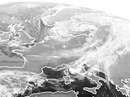 Sturmtief 'Britta' zieht über die Ostsee ostwärts ab. Man erkennt auf dem Satellitenbild wie dabei von der Nordsee her lockere Schauerbewölkung in Richtung Deutschland strömt, die sich in der sehr kalten Luft gebildet hat.