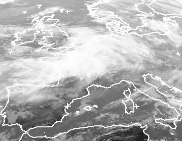 Auf dem Satellitenbild vom Sonntagmittag liegt das Zentrum von Sturmtief 'Fridtjof' über England. Es zieht jedoch rasch ostwärts. Auf seiner Vorderseite liegt ein dichtes Wolkengebiet, aus dem es teils auch kräftig regnet. Auf der Rückseite des Tiefs erkennt man auch Auflockerungen. (Bildquelle: NERC Satellite Receiving Station, Dundee University, Scotland, http://www.sat.dundee.ac.uk/)