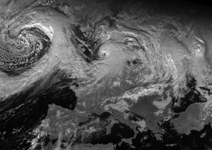 Auf dem Satellitenbild ist über der Nordsee das Sturmtief 'Jürgen' erkennbar, das heute dem Norden Regen und Sturm gebracht hat. Nordwestlich der Britischen Inseln ist das Tief 'Klaus' zu sehen. Deutlich sind an der Bewölkung Warm- und Kaltfront erkennbar, sowie die nach Norden vordringende Warmluft und die nach Süden vordringende Kaltluft.