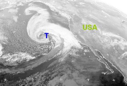 Der Ausschnitt zeigt ein kräftiges Tief nahe der US – Pazifikküste, man erkennt es an einer Wolkenspirale. Auf der Rückseite des Tiefs haben sich in feucht-kalter Lüft mehrere Schauerwolken entwickelt. Am Sonntag bringt das Tief zum Teil kräftige Regenfälle im Westen der USA. (Bildquelle: NERC Satellite Receiving Station, Dundee University, Scotland, http://www.sat.dundee.ac.uk/)