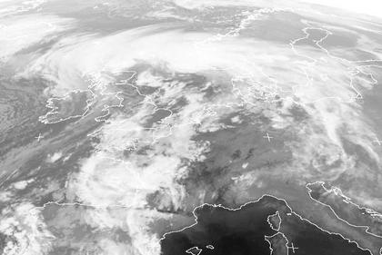Das Sturmtief 'Yanqiu' liegt am Donnerstagmorgen mit seinem Zentrum über Schottland. Der Wirbel in höheren Luftschichten, der auf diesem Bild deutlich besser an den hellen Wolken zu erkennen ist, liegt dagegen etwas weiter westlich, und auch die kälteste Luft ist an dem getupften Wolkenbild nördlich und westlich von Irland zu erkennen. Viel imposanter ist dagegen der Warmsektor des Tiefdruckgebiets, der sich über ganz Mitteluropa und Teile von Frankreich erstreckt. In diesem Bereich sind in warmer Mittelmeerluft Temperaturrekorde für das letzte Oktoberdrittel zu erwarten. Diese Kombination zwischen Kaltluft westlich des Tiefdruckkerns und sehr warmer Luft östlich davon sorgt für viel potentielle Energie, sodass sich das Tief im Laufe des Tages weiter zum Orkantief verstärken kann.