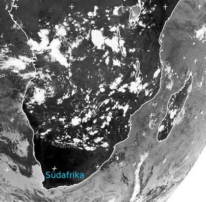Während in weiten Teilen des südlichen afrikanischen Kontinents auf dem Infrarot-Satellitenbild von Donnerstag Mittag einzelne Schauer- und Gewitterzellen durchziehen, ist es in Südafrika nahezu wolkenlos. Mit der Sonneneinstrahlung konnten sich die Landmassen dann auch stark erwärmen, was in dem Bild durch die fast schwarze Darstellung deutlich wird. (Bildquelle: NERC Satellite Receiving Station, Dundee University, Scotland, http://www.sat.dundee.ac.uk/)
