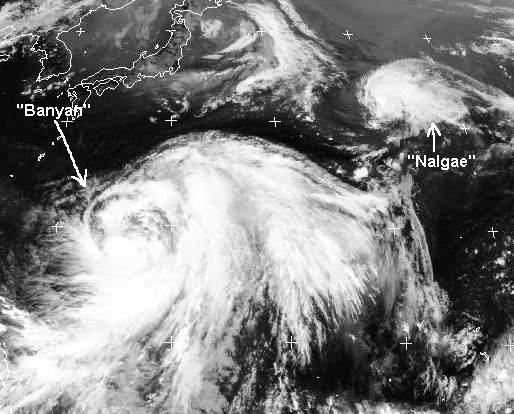 Der tropische Sturm 'Banyan' über dem westlichen Pazifik verlagert sich nach Norden in Richtung Japan. Berechnungen zufolge verstärkt er sich in den nächsten Tagen zum Taifun und streift im Laufe der nächsten Woche die Südostküste Japans, seine Windgeschwindigkeiten erreichen 210, in Böen bis zu 260 km/h.