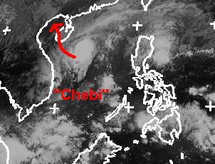 Der Taifun 'Chebi' befindet sich jetzt im südchinesischen Meer und hat sich etwas abgeschwächt. Zur Zeit erreicht er mittlere Windgeschwindigkeiten von 111, im Böen 138 km/h, und soll sich noch weiter abschwächen. Berechnungen zufolge erreicht er am Mittwoch die chinesische Insel Hainan Dao erreichen. (Bildquelle: NERC Satellite Receiving Station, Dundee University, Scotland, http://www.sat.dundee.ac.uk/)