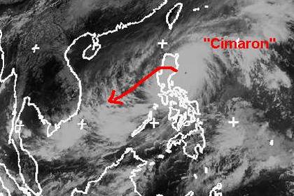 Östlich der Philippinen befindet sich zur Zeit er Taifun 'Cimaron'. Zurzeit erreicht er mittlere Windgeschwindigkeiten von 223, in Böen 268 km/h. Berechnungen zufolge soll er sich noch etwas verstärken, und am Montag die nördlichen Philippinen von Ost nach West überqueren und sich etwas abschwächen. Auf dem Satellitenbild von Sonntag früh ist das Auge des Wirbelsturms gut zu erkennen. (Bildquelle: NERC Satellite Receiving Station, Dundee University, Scotland, http://www.sat.dundee.ac.uk/)