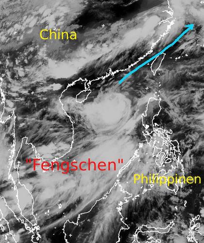 Der Taifun 'Fengschen' über dem Südchinesischen Meer erreicht heute Windgeschwindigkeiten von 100 km/h im Mittel und bis 130 km/h in Böen. Er hat sich etwas abgeschwächt, sorgt aber weiter für hohe Regenmengen, jedoch meist nur über dem Ozean. 'Fengschen' wandert nach Nordosten weiter auf Taiwan und nachfolgend auch auf Japan zu. Er wird sich voraussichtlich aber nicht wieder verstärken. (Bildquelle: Copyrigt EUMETSAT, NERC Satellite Receiving Station, University of Dundee)