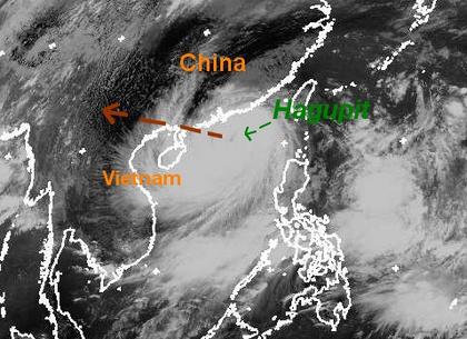 Der Ausschnitt zeigt Taifun 'Hagupit' über dem Südchinesischen Meer vor der chinesischen Südküste. Seine mittleren Windgeschwindigkeiten erreichen zur Zeit 194 km/h, in Böen bis zu 240 km/h. Berechnung zufolge wird er in den nächsten Stunden auf das Land südwestlich von Hongkong treffen. Neben kräftigem Wind sind auch ergiebige Regenfälle mit daraus folgenden Überflutungen zu erwarten. (Bildquelle: NERC Satellite Receiving Station, Dundee University, Scotland, http://www.sat.dundee.ac.uk/)