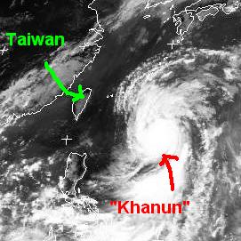 Über dem westlichen Pazifik hat sich der Taifun 'Khanun' entwickelt. Er erreicht zur Zeit Windgeschwindigkeiten von 149, in Böen 166 km/h und bewegt sich nach Nordwesten in Richtung Taiwan. Berechnungen zufolge erreicht er am Sonntag die Insel mit Windgeschwindigkeiten von etwa 175, in Böen 210 km/h und zieht dann unter Abschwächung weiter Richtung Südostküste Chinas.