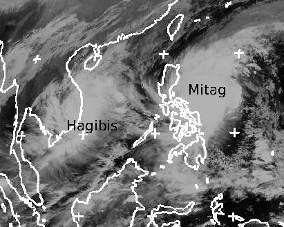 Der Taifun 'Mitag' liegt mit mittleren Windgeschwindigkeiten bis 180 km/h und Böen bis 225 km/h auf der Ostseite der nördlichen Philippinen. Er zieht nur langsam westwärts über den Norden der Inselgruppe hinweg. Dabei kommt es auch zu sehr ergiebigen Regenfällen.