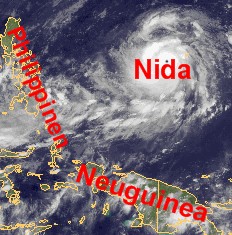 Auf dem heutigen Satellitenfoto zeigt sich der kräftige Taifun 'Nida' im Westpazifik in einigen 100 Kilometern Entfernung zu den Philippinen und zu Neuguinea. Zur Zeit zieht der tropische Wirbelsturm mit einer Zuggeschwindigkeit von etwa 20 km/h weiter nach Nordwesten und ab morgen dreht er auf eine nördliche Zugbahn. Bei einem Windmittel von 230 km/h und in Böen bis zu 290 km/h wird sich 'Nida' voraussichtlich noch bis morgen früh noch etwas verstärken, wobei dann Windböen bis 330 km/h möglich sind. Im Laufe des Donnerstags nimmt der Taifun zunächst nur langsam an Stärke ab.