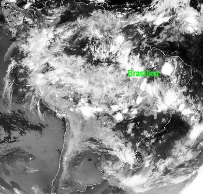 Auf dem heutigen Satellitenbild zeigt sich besonders über dem Norden und der Mitte Brasiliens, aber auch weiter bis zur Pazifikküste von Ecuador und Peru vielfach hochreichende Quellbewölkung, die vielerort zu teils kräftigen Schauern und Gewittern führt. In Brasilien sind örtlich Regenmengen von über 50 Litern innerhalb von 6 Stunden möglich, so dass mit lokalen Überschwemmungen und Erdrutschungen zu rechnen ist. Im weiteren Verlauf verlagert sich der Unwetterschwerpunkt auf einen Streifen von Bolivien bis in die Mitte Brasiliens.