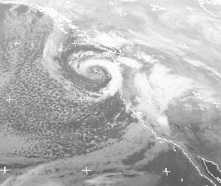Vor der Küste von Washington und Oregon liegt ein Tief, das über dem Pazifik kalte Luft nach Süden transportiert. Hier bilden sich lockere Schauerwolken. Teils dichtere Wolkenfelder entlang seiner Kaltfront in das Landesinnere. Hier kommt es zu Regen, im Bergland auch zu Schnee. Örtlich bilden sich auch Gewitter. (Bildquelle: NERC Satellite Receiving Station, Dundee University, Scotland, http://www.sat.dundee.ac.uk/)