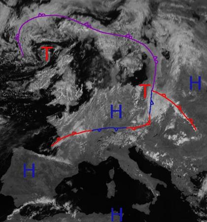 Tief 'Detlef' mit seinem Zentrum etwa vor Schottland liegt mit seinen Ausläufern und Wolken von Island bis nach Skandinavien, weiter südlich nach Tschechien und wieder weiter westlich bis nach Frankreich. Das Tief ist umgeben von mehreren Hochdruckgebieten. In Mitteleuropa ist es aber nicht wolkenfrei, teils haben sich einige Quellwolken in noch feuchter Luft gebildet. Dagegen sorgt der Hochdruckeinfluss von Nordspanien bis zum Mittelmeer für meist sehr sonniges Wetter.