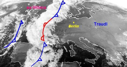 Das Frontensystem des Tiefs 'ex-Wilma' (der ehemalige Hurrikan) über dem Atlantik erstreckt sich auf dem Satellitenbild vom Montagmorgen von Norwegen bis zur Iberischen Halbinsel, kräftige Niederschläge sind dabei vor allem in Frankreich zu erwarten; am Dienstag zieht die Regenfront bis nach Deutschland und Italien heran, sie schwächt sich jedoch allmählich ab. In weiten Teilen Mittel- und Osteuropas ist es unter dem Einfluss des Hochs 'Traudl' über Westrussland weiter teils sonnig, teils trüb.
