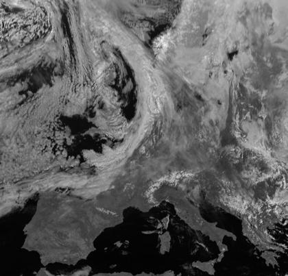 Die Kaltfront von Tief 'Franjo' bei Schottland zeichnet sich auf dem Satellitenbild vom Samstagmittag mit einem deutlichen Wolkenband ab. Es erstreckt sich im Bogen von der Nordsee nach Nordfrankreich und zieht dabei allmählich ostwärts. Schon über Deutschland liegt der Bereich der Warmfront des Tiefs, die sich weniger deutlich abzeichnet. Verbreitet liegt hier eher hohe Bewölkung, durch die teilweise auch die Sonne durchscheinen kann.