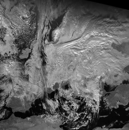 Auf dem Satellitenbild von Europa ist über Mitteleuropa und dem südlichen Nordeuropa die Bewölkung des Tiefsystems 'Fritz' zu erkennen, das sich bis nach Finnland zieht. Zwischen Irland und Island ist die zelluläre Bewölkung auf der Rückseite einer Kaltfront zu sehen.