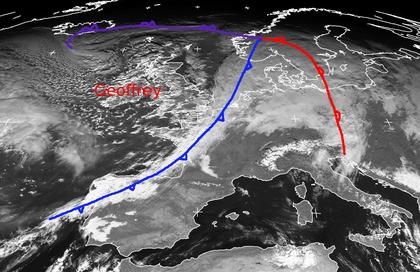 Das Tief 'Geoffrey' hat sich seit gestern langsam Richtung Mitteleuropa weiter bewegt. Heute Mittag liegt die Bewölkung der Warmfront von Süd-Skandinavien bis nach Polen und Nordost-Italien. In der von Spanien bis nach Süddeutschland reichenden wolkenfreien Zonen erkennt man sehr gut die schneebedeckten Alpen. Nordwestlich davon befindet sich von Nord-Spanien über Nord-Frankreich bis nach Süd-Skandinavien die Kaltfront von 'Geoffrey'. Sie zieht in der Nacht über Mitteleuropa und Deutschland hinweg, ihr folgt dann die über den Britischen Inseln und westlich davon liegende Schauerbewölkung auf dem Weg nach Südosten. (Bildquelle: NERC Satellite Receiving Station, Dundee University, Scotland, http://www.sat.dundee.ac.uk/)