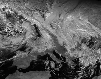 Auf dem Satellitenbild ist nordwestlich der Britischen Inseln das Atlantiktief 'Gerhard' mit seinen Ausläufern zu sehen. Deutlich tritt die Schichtbewölkung der Warmfront und die zelluläre Bewölkung in der labilisierten Kaltluft hervor. Die großen Alpenseen, der Plattensee in Ungarn sowie die verschneiten Hochlagen der Alpen und der Apenninen sind ebenfalls erkennbar.