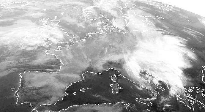 Auf dem Satellitenbild von Donnerstag früh sind über dem Balkan dichte Wolken zu erkennen, in denen sich heute teils kräftige Schauer und Gewitter bilden. Diese Wolken gehören zu dem Tief 'Isidor' mit seinem Zentrum über Jugoslawien. In Mittel- und Westeuropa ist sonst nur lockere Bewölkung zu erkennen.