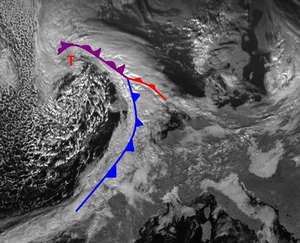 Die Ausläufer des Sturmtiefs 'Ludwig' mit Zentrum über dem Atlantik sind auf dem Satellitenbild von Samstag Mittag gut zu erkennen. Dichte Wolken erstrecken sich vor allem über Großbritannien und dem Norden von Frankreich und Spanien. Vor Allem in Großbritannien bringt die Kaltfront teils kräftige und ergiebige Niederschläge und teils stürmischen Wind.