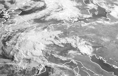 Über der Nordsee erkennt man die Wolkenspirale eines Tiefs. Es ist jedoch für Deutschland ohne Bedeutung. Weite Teile des Landes sind noch gering bewölkt, wie auch die Regionen weiter im Osten. Hier liegt noch das Hoch 'Yves'. Über Frankreich liegt dagegen das Gewittertief 'Queeny'. In seinem Bereich haben sich schon viele Wolken entwickelt. Auch in Deutschland kommt es am Abend und in der Nacht zu teils kräftigen Gewittern.
