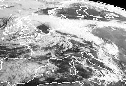 Tief 'Quintus' über England schickt von Westen wechselhafte Schauerbewölkung nach Deutschland. Über dem Norden liegt aber noch die dichte Bewölkung der Fronten des Tief, dabei waren im Nordosten noch Gewitter eingelagert. (Bildquelle: NERC Satellite Receiving Station, Dundee University, Scotland, http://www.sat.dundee.ac.uk/)