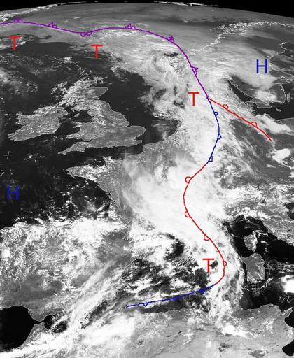 Das Tief 'Rafaela' mit seinem Hauptzentrum über der Nordsee liegt mit seinen Ausläufern und der dazugehörigen Bewölkung am Mittwoch Mittag von Island bis zum westlichen Skandinavien über Westdeutschland, Südfrankreich und ins westliche Mittelmeer. Eine schwache Warmfront hat dabei auch Nordostdeutschland mit Wolken erfasst. Sowohl westlich als auch östlich dieses Tiefdrucksystems befinden sich Hochdruckzentren, die dafür sorgen, dass es nur gering bewölkt ist. Das Hoch im Westen setzt sich in den nächsten Tagen über Mitteleuropa durch und sorgt für meist freundliches Wetter. (Bildquelle: Copyrigt EUMETSAT, NERC Satellite Receiving Station, University of Dundee)