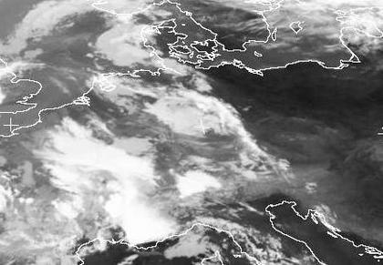 Das Gewittertief 'Ramona' liegt am Donnerstagmorgen genau über Deutschland. Man erkennt schön die beteiligten Luftmassen: Während im Nordosten noch trockene und sehr warme (daher auf dem Wärmebild dunkle) Luft aus Osteuropa liegt, hat sich im Westen eine feuchtere Luftmasse durchgesetzt, in der sich teilweise hoch reichende, und daher auf ihren Oberseiten helle und kalte Gewittertürme gebildet haben.