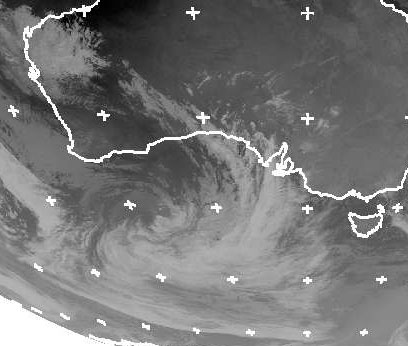 Über dem Südpolarmeer erkennt man einen Tiefdruckwirbel, dessen Ausläufer sich an die Südküste und bis ins Landesinnere erstreckt. Regen bringen die Wolken aber kaum. Das Tief sorgt aber auch dafür, das die feucht-warme Luft vom Indischen Ozean in den Westen des Kontinents gelangt, hier kommt es zum Teil zu Regen. Sonst ist es auf dem Kontinent meist trocken und freundlich.