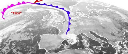 Westlich von Island befindet sich zur Zeit das Sturmtief 'Trixi'. Seine Kaltfront sorgt heute vor allem in Frankreich und den Benelux-Staaten für etwas Regen. Sonst ist es unter leichten Hochdruckeinfluss teils neblig-trüb, teils auch heiter und trocken.