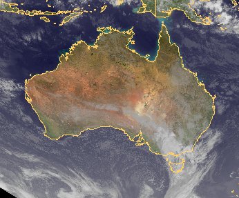 Über dem Norden Australiens finden sich kaum Wolken. In die Südhälfte des Kontinents ist ein Ausläufer eines Tiefs über dem Südpolarmeer mit seinen Wolken gezogen. Er bringt vor allem in Victoria auch viel Regen.