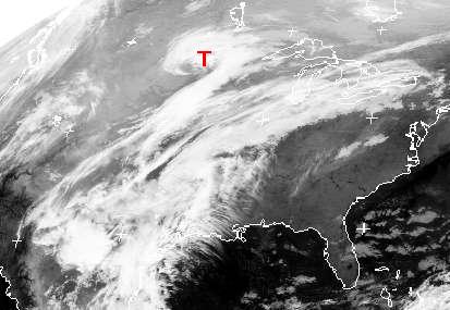 Auf dem Satellitenbild von Samstag früh ist ein Tief an der Grenze von USA und Kanada gut zu erkennen. Seine Ausläufer sorgen heute vor allem über dem Mittleren Westen der USA bis nach Texas für teils kräftige und unwetterartige Schauer und Gewitter. (Bildquelle: NERC Satellite Receiving Station, Dundee University, Scotland, http://www.sat.dundee.ac.uk/)